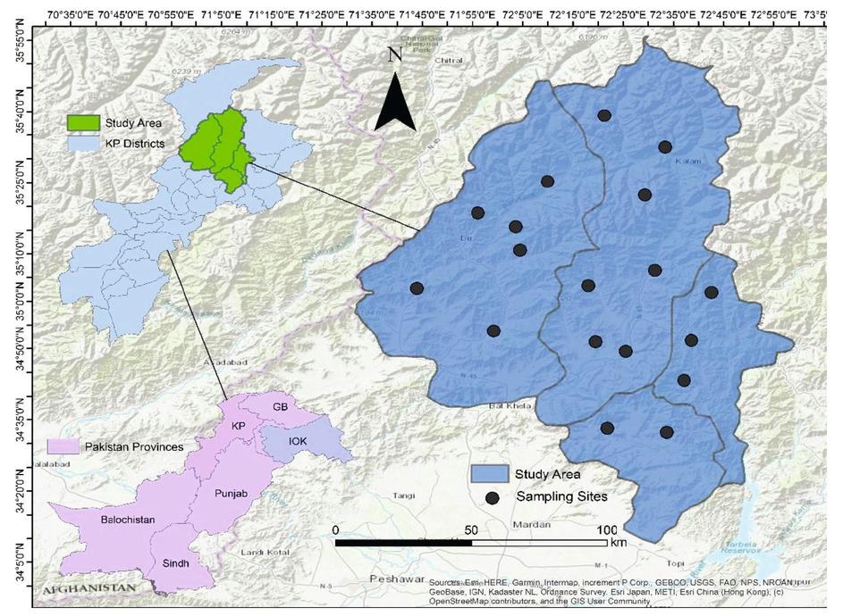 A total of 70 chukar partridge A. chukar (23 male and 47 female) were caught by hunters from 18 different localities during the shooting seasons in northern Pakistan from October 2020 to the end of December 2021 (Fig 1). Birds were collected instantly after being shot by hunters, packed in individual plastic bags, and brought to the Department of Parasitology Abdul Wali Khan University Mardan, Pakistan for parasitological analysis. Each bird was given a thorough examination with the results showing that almost all of them were healthy. None of them showed injuries, skin lesions (such as hyperdermatosis, epidermitis and acanthosis) or excessive feather loss or damage. All of the specimens were adult and older than one year, as judged from the observation of the plumage pattern and weight. Sex differentiation was always confirmed by gonadal checking. After decapitation, the abdominal and thoracic cavities were opened, followed by systemic autopsy examination which include, the esophagus through to the gizzard, the small intestine, duodenum, (jejunum and ileum), the caeca, and the ileocecal junction to the cloaca. Each section was opened longitudinally. The intestinal scrapping and floatation methods were used to collect the parasites (Calvete et al., 2003). After being cleaned with 1 % normal saline, the recovered helminths were then preserved in 70 % alcohol. Trematodes and cestodes were all dyed in the lab with acetocarmine and then cleaned with xylene, while nematodes were cleared with lactophenol. Each specimens were morphologically identified using morpho-taxonomic signs and standard identification keys under stereo zoom microscope (SZM405, HT Company Ltd, ILF, UK) (Soulsby, 1982).