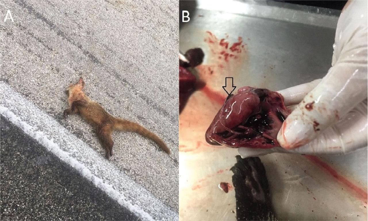 A) Image of one of the specimens (Nasua narica) collected on the Mérida-Cancún highway, Mexico. B) The aspect of the nematodes (arrow) collected in the heart. It can be seen that they are worms with elongated, cylindrical, and non-segmented bodies with bilateral symmetry.