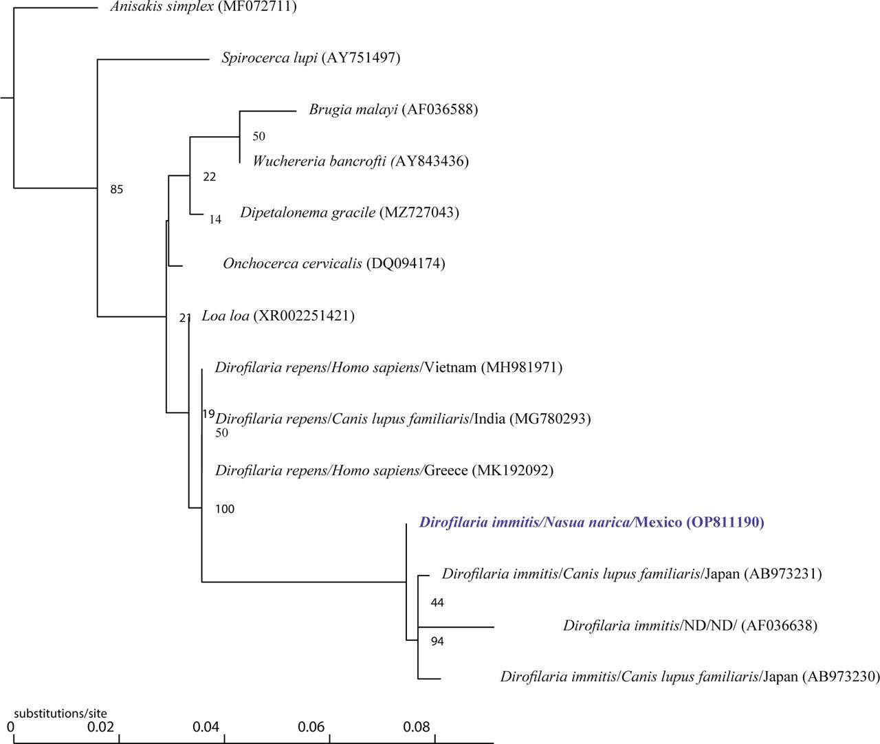 As far as we know, this is the first molecular description of the D. immitis natural infection in N. narica from Mexico and North America. On an international level, the records of natural infection with D. immitis in Nasua sp. have been described in Argentina (Mazza, 1926; Mancebo et al., 1992) and Brazil (Figuerêdo Duarte Moraes et al., 2022). Additionally, in the Americas, the generated sequence in this study is the first sequence of D. immitis for this mammal host.