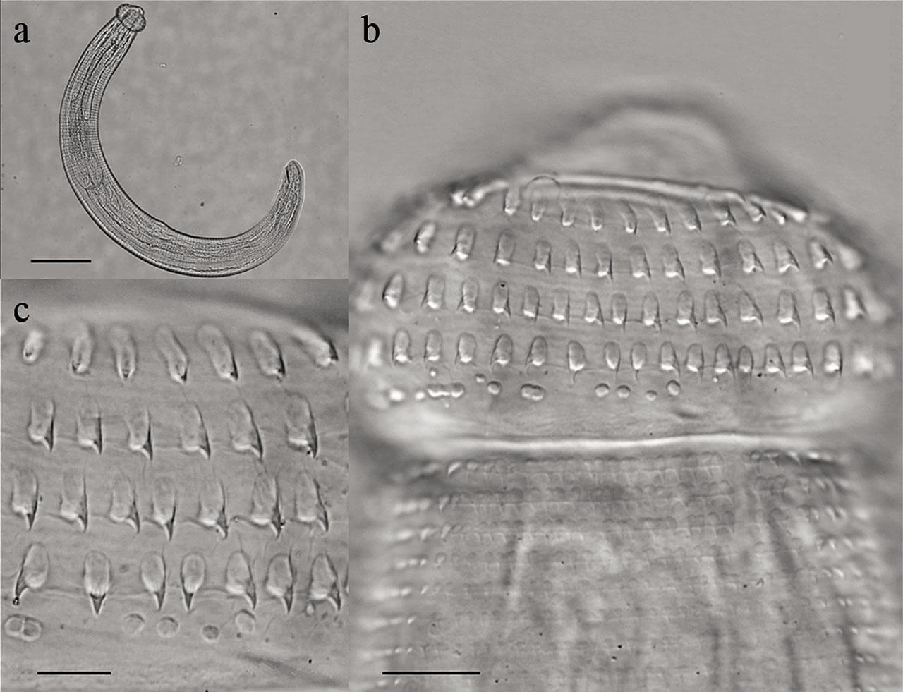 Advanced third stage larva of Gnathostoma turgidum. a) Lateral view of the body; b) Cephalic bulb; c) Detail of the spines in the rows of the cephalic bulb. Scales: a= 200 μm; b=20 μm; c= 10 μm.