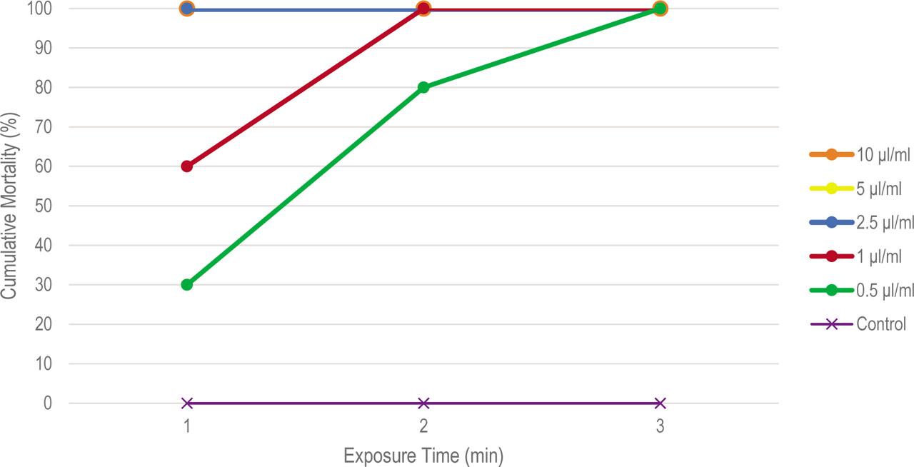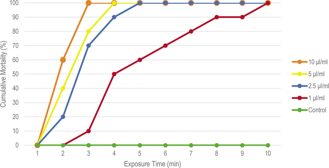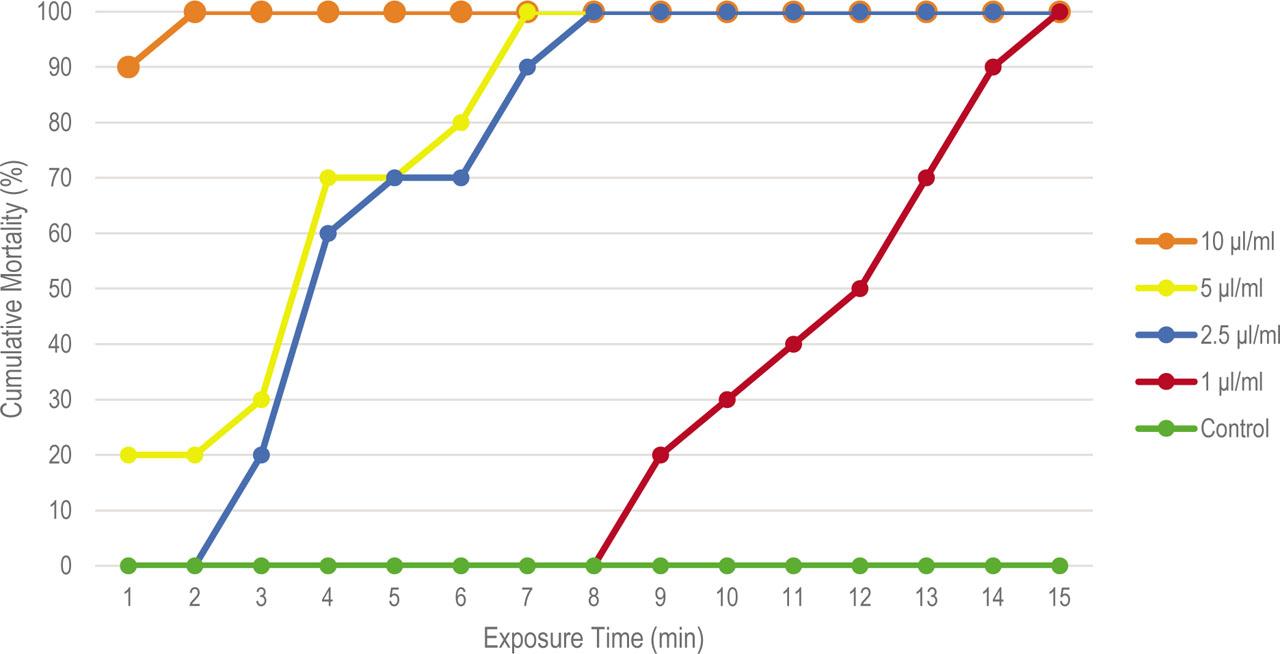 In in vitro peppermint essential oil tests, cumulative mortality of Dactylogyrus sp. was observed to reach 100 % at 10 μl/ml in 2 min, at 5 μl/ml in 7 min, at 2.5 μl/ml in 8 min and at 1 μl/ml in 15 min (Fig. 1). The antiparasitic effect was observed to increase with increasing concentration and exposure duration.