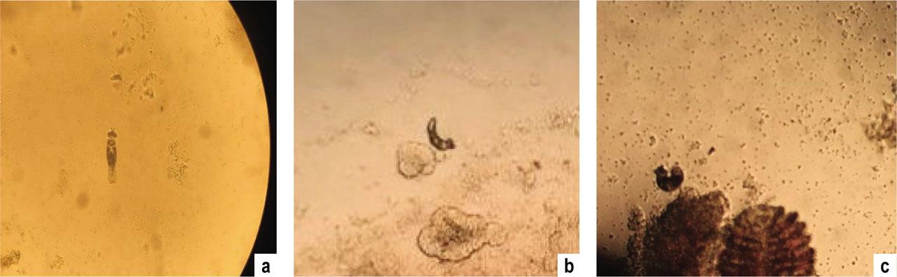 Parasite behavior; (a) Dactylogyrus sp. before exposure (alive); (b) Contraction of Dactylogyrus sp. after exposure (c) Death of Dactylogyrus sp. after exposure.