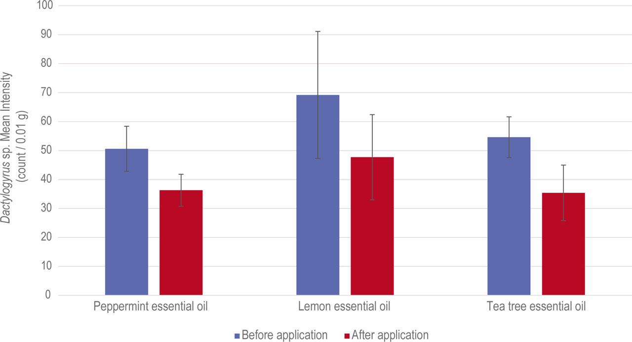 Dactylogyrus sp. mean intensity in carp gills before and after in vivo application of peppermint, lemon, and tea tree essential oils.