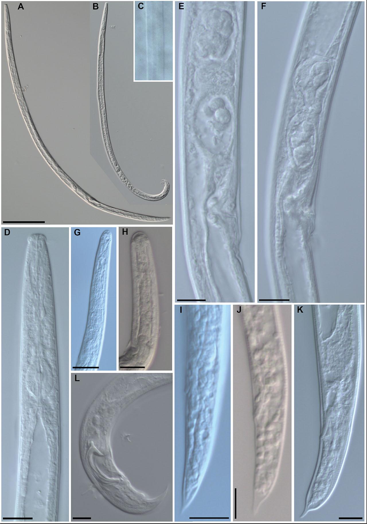 Light micrograph of Bursaphelenchus mucronatus. A: Female entire body; B: Male entire body; C: Lateral field with four incisures; D: Female anterior region; E, F: Vulva; G, H: Dauer larvae anterior part; I, J: Dauer larvae tail tip; K: Female tail tip; L: Mail tail; A, B, C, D, E, F, G, I, K, L: Georgian population; H, J: BiH population; A, B – 100 µm; C-L – 10 µm.