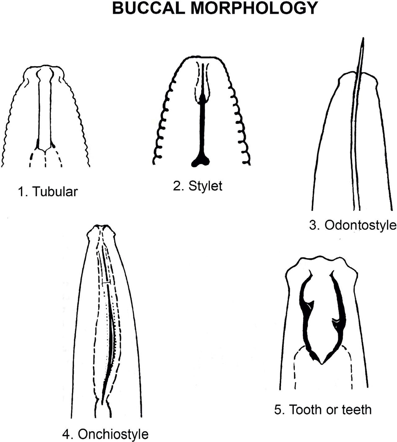 Occurrence and morphology of possible cuticularizations in the buccal cavity: 1.unarmed buccal cavity; 2. stylet; 3. odontostyle; 4. onchiostyle; 5. tooth or teeth.