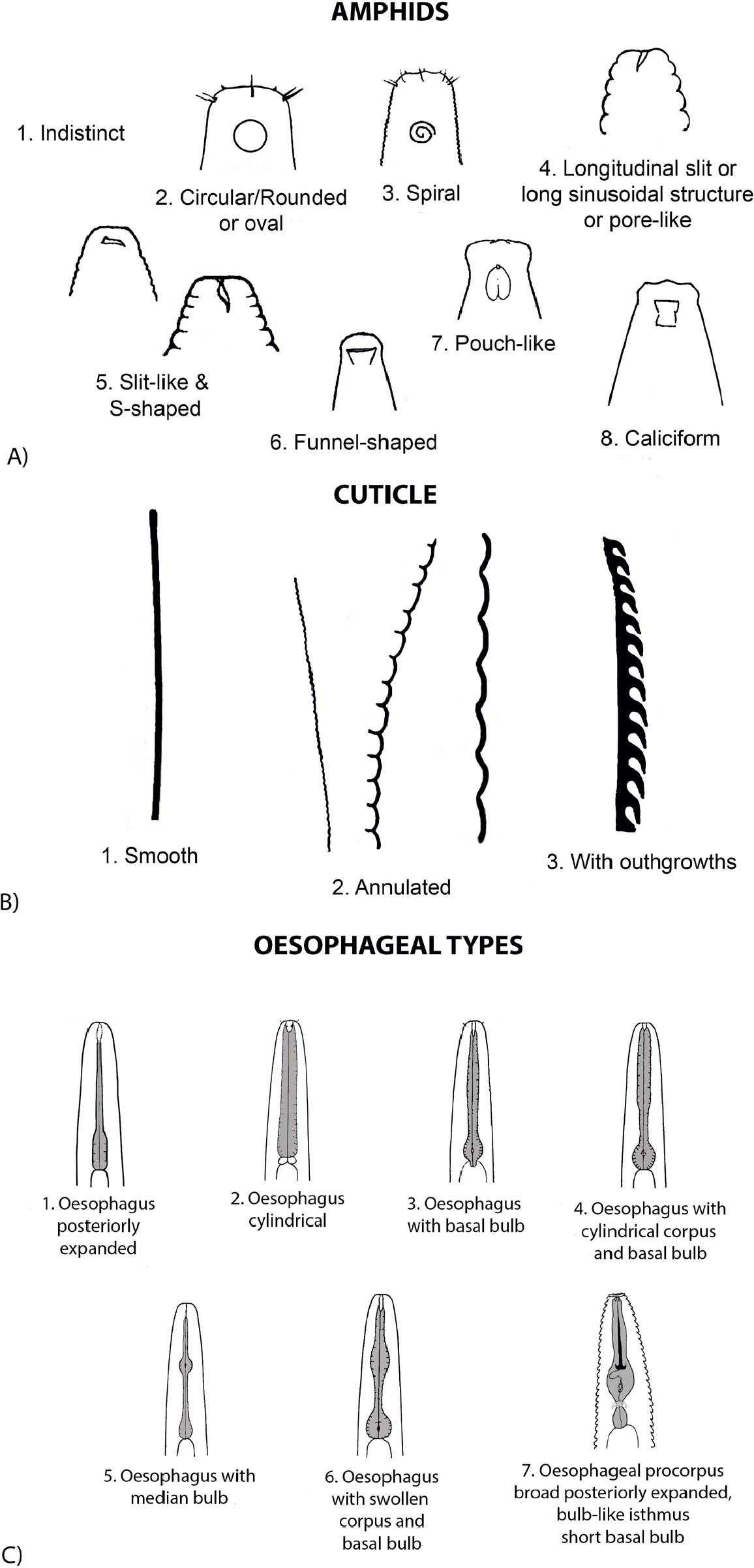 A) Amphideal fovea: 1. undetected; 2. circular/rounded or oval; 3. spiral; 4. thin, narrow slit or pore-like; 5. large slite-like & S-shape; 6. funnel-shape; 7. pouch-like; 8. caliciform. B) Cuticles: 1. smooth; 2. annulated; 3. with outhgrowths; C) Oesophageal shape: 1. oesophagus posteriorly expanded; 2. oesophagus cylindrical; 3. oesophagus with basal bulb; 4. oesophagus with cylindrical corpus and basal bulb; 5. oesophagus with median bulb; 6. oesophagus with median bulb; 6. oesophagus with swollen corpus and basal bulb; 7. oesophageal procorpus broad posteriorly expanded, bulb-like isthmus short basal bulb.