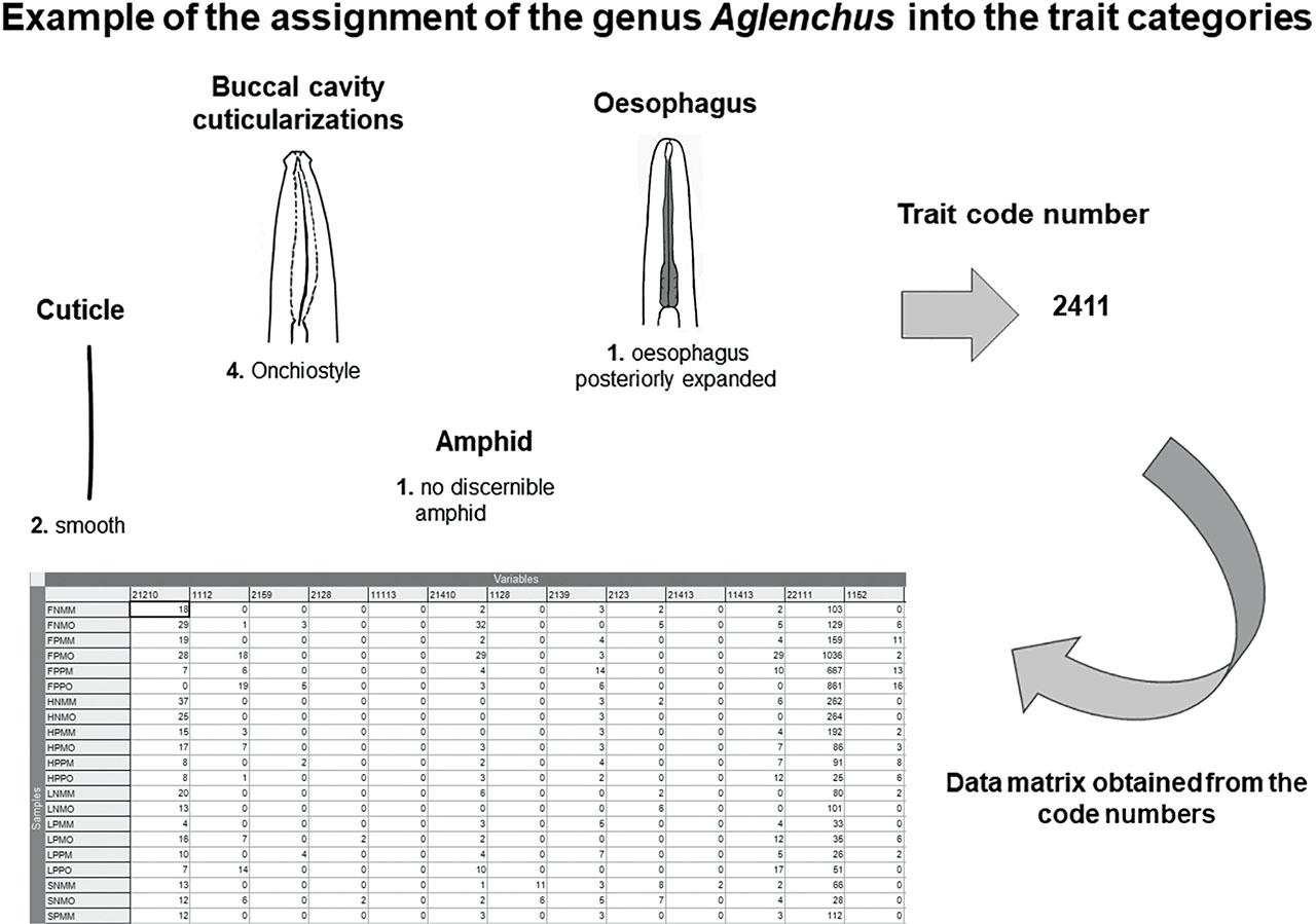 After defining of the various categories of each morpho-functional trait (buccal cavity, amphid, cuticle and pharynx), each genus was assigned to the most suitable category based on its morphological appearance and each taxon was given its own number code (Fig. 3).