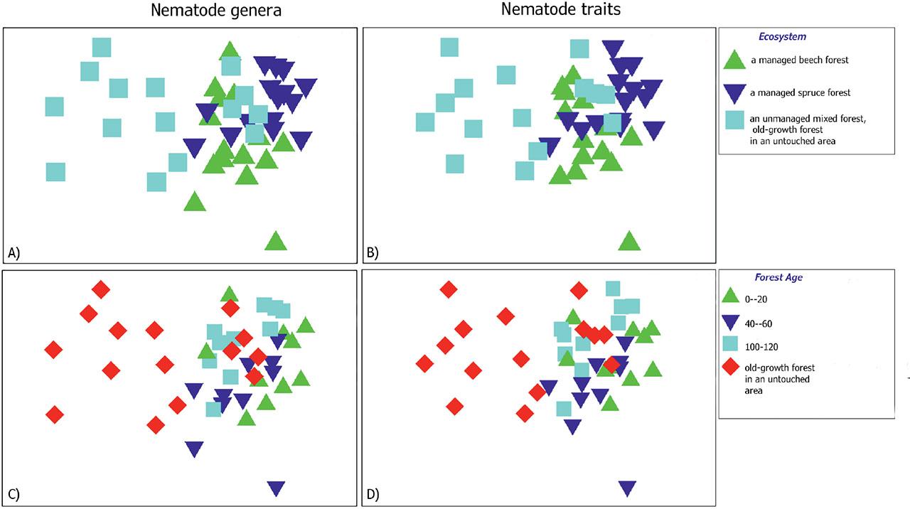 nMDS carried out on both nematode genera and trait codes (Bray–Curtis similarity, untransformed data) from forest ecosystems in Slovakia. Factors analyzed: A, B) managed beech forest (BEE), managed spruce forest (SPR), and unmanaged mixed forest (UNM). C-D) BEE and SPR plots were stratified by stand age: 0–20, 40–60, and 100–120 age.