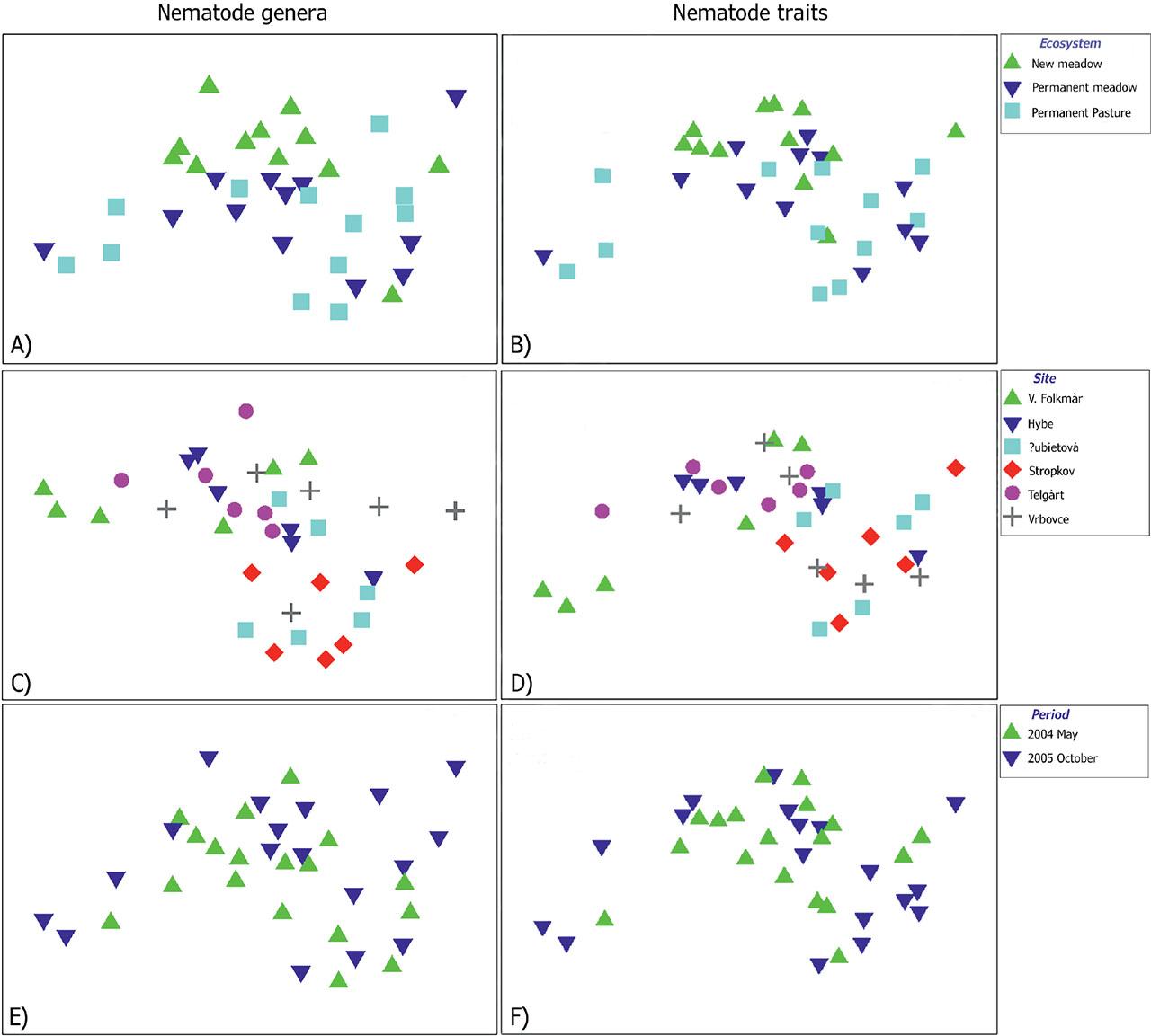 nMDS carried out on both nematode genera and trait codes (Bray–Curtis similarity, untransformed data) from grassland types of various regions of the Slovak Republic. Factors analyzed: A, B) localities placed around Slovakia (i.e. Ľubietová, Stropkov, Telgárt, Vrbovce and Veľký Folkmár); C, D) type of grassland: NM (established during last 3 years), PM (covered with indigenous multispecies vegetation irregularly mown) and PP (with indigenous vegetation regularly grazed); E, F) period (May 2004 and October 2005).