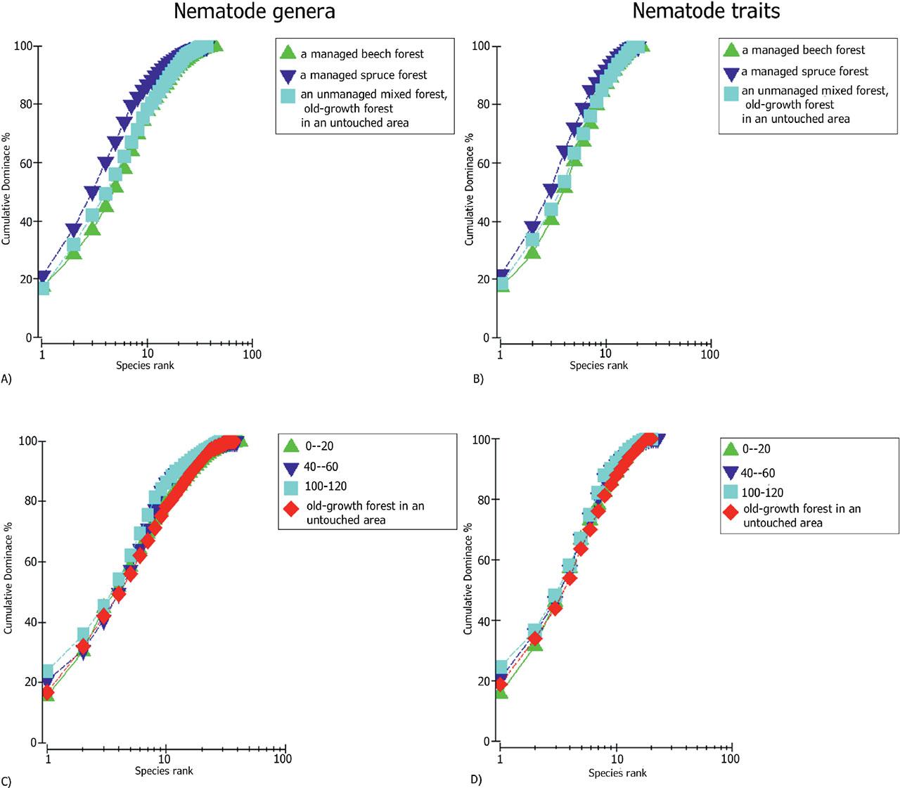 k-dominance curves carried out on both nematode genera and trait codes from forest ecosystems in Slovakia. Factors analyzed: A, B) managed beech forest (BEE), managed spruce forest (SPR), and unmanaged mixed forest (UNM). C-D) BEE and SPR plots were also stratified by stand age: 0–20, 40–60, and 100–120 age.