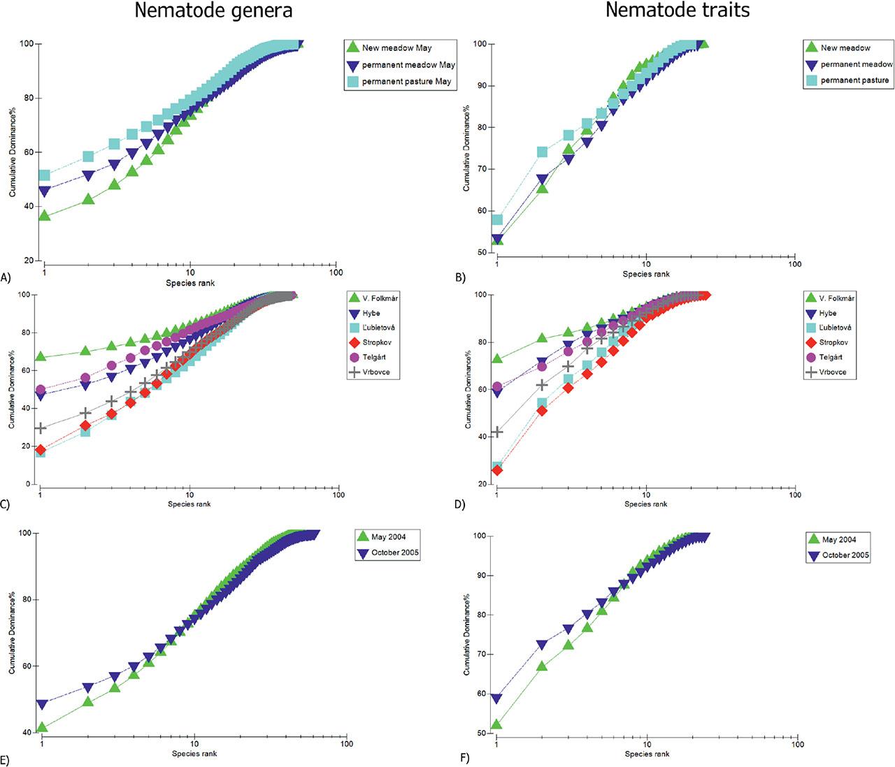k-dominance curves carried out on both nematode genera and trait codes from grassland types of various regions of the Slovak Republic. Factors analyzed: A, B) type of grassland: NM (established during last 3 years), PM (covered with indigenous multispecies vegetation irregularly mown) and PP (with indigenous vegetation regularly grazed); C, D) localities placed around Slovakia (i.e. Ľubietová, Stropkov, Telgárt, Vrbovce and Veľký Folkmár); E, F) period (May 2004 and October 2005).