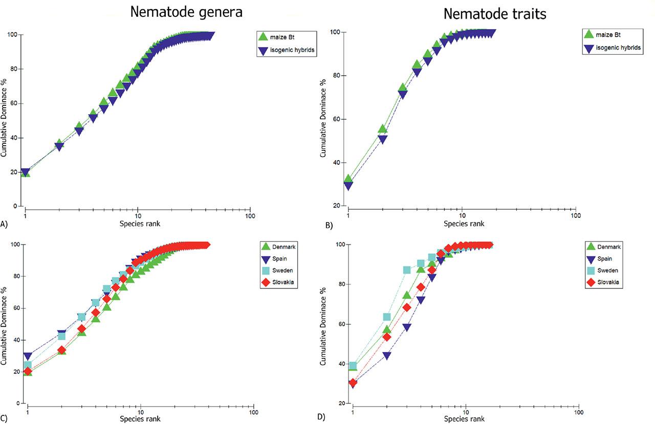 The above insights are confirmed also by the trends observable from the k-dominance curves, where nematode diversity is consistent among genus and code trait combination (Figs. 7 – 9). The only exception as remarked by the multivatiate analyses were the comparisons among countries in the study on modified maize (Fig. 9).