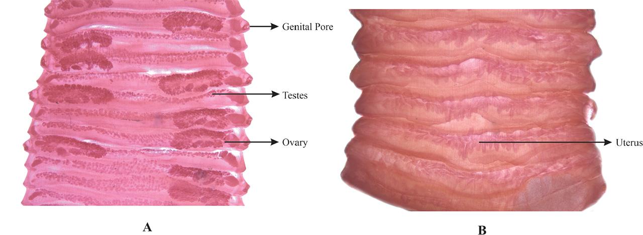 Proglottids were much broader than long (length = 1.688 mm, width = 15.905 mm of the stained specimen). Irregularly alternating genital pores with single set of reproductive organs were noticed in each proglottid. Testes were approximately 280 per proglottid, occupying dorsal anterior portion of proglottid. Thick-walled small cirrus sac was present. Transverse uterus was found extending in tubular stage across middle of proglottid (Fig 1).