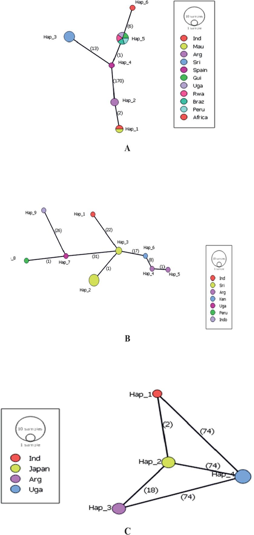 Overall, six haplotypes of Bertiella spp. (Table 2, Fig. 5) were identified based on 18SrRNA gene. Out of six haplotypes, haplotype 5 was widespread with their existence in Brazil, Peru, Guinea, Rwanda and Uganda. Haplotype 1 was observed in India and Mauritius. Remaining four haplotypes were unique to different countries. Nine haplotypes of Bertiella spp. identified based on COX1 gene, were unique to each country. The frequency of haplotypes 2 and 3 from Sri Lanka was high. The haplotype analysis using ITS1 5.8S sequences could identify four haplotypes in accordance with the variable site distribution. A high level of frequency of population was documented in haplotype 4 from Uganda.