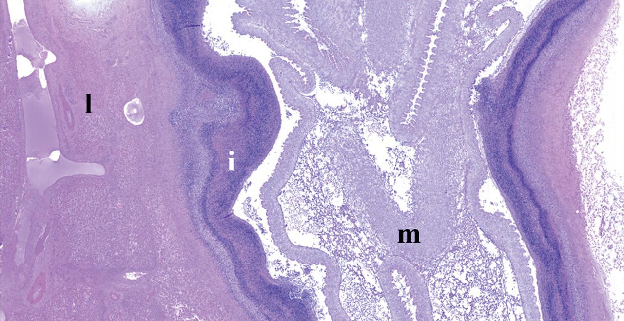 Sub gross photomicrography of the liver. A metacestode (m) parasitic structure is included in a cyst surrounded with a dense band of inflammatory cells (i); the adjacent liver (l) tissue is unremarkable. Hematoxylin and eosin, 2X.