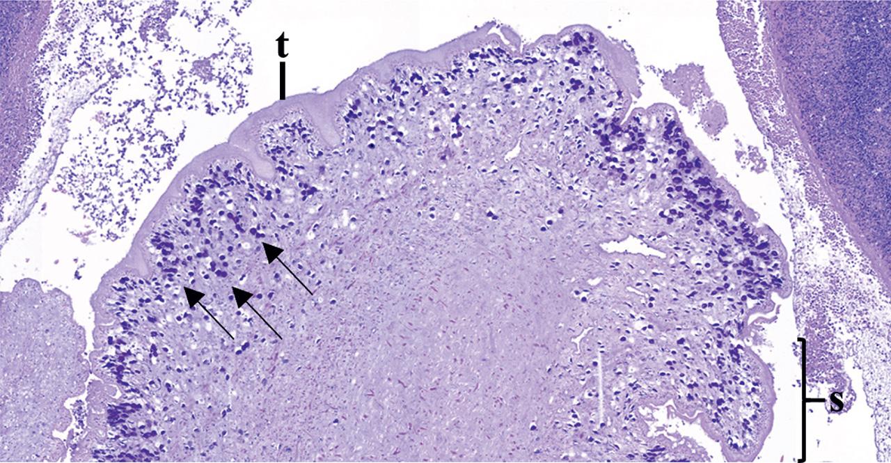 Histologic details of the metacestode parasitic structure included in the cyst, with absence of a digestive tract, tegument (t), segmented body (s) and the presence of calcareous corpuscles (arrows). Hematoxylin and eosin, 6X.