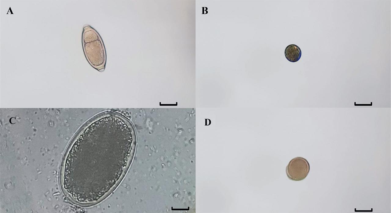 Light micrograph of coproparasitological examination in wild birds. (A) Capillarinae eggs in Ara macao, Scale bar 30µm. (B) Entamoeba spp. oocyst in Ara macao, Scale bar 15µm. (C) Ascaridia spp. egg in Ara chloropterus, Scale bar 20µm. (D) Ascarididae egg in Anodorhynchus hyacinthinus, Scale bar 40µm.