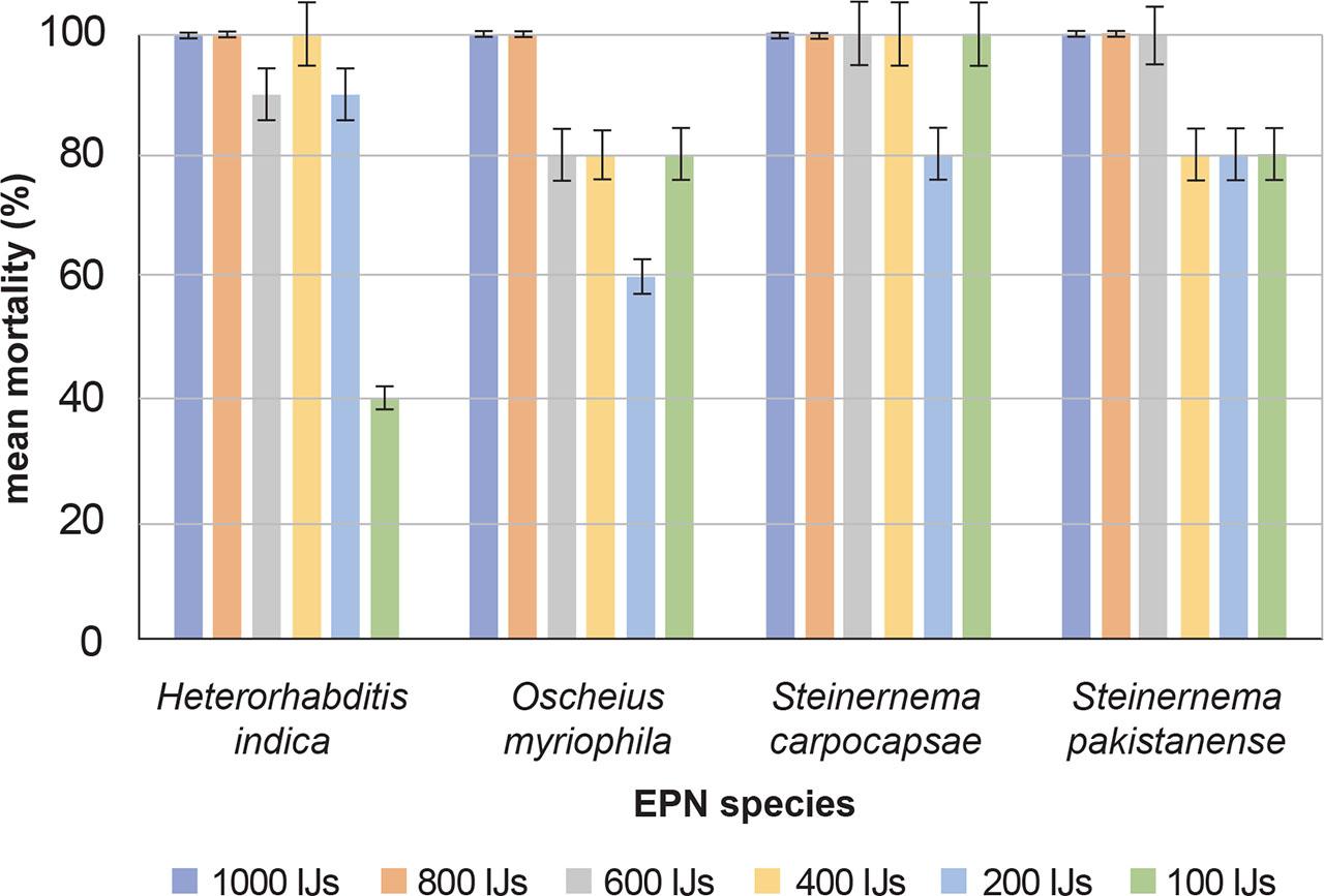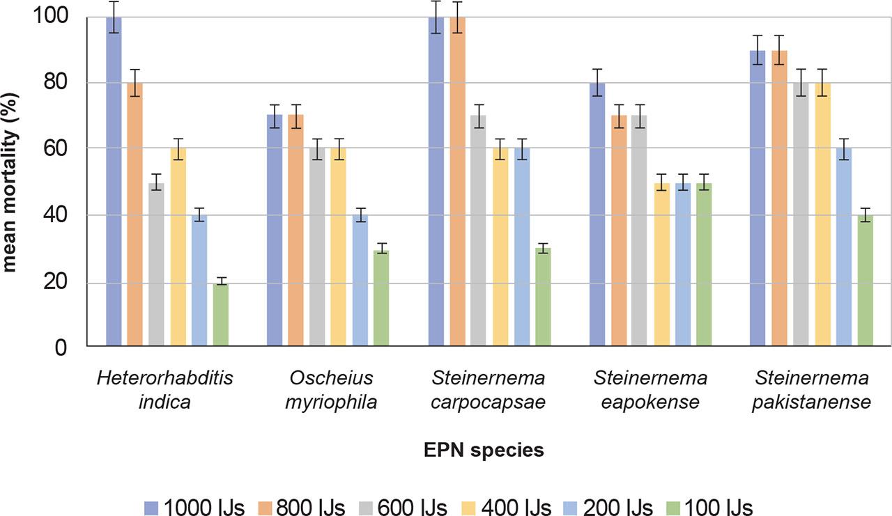 Virulence of Heterorhabditis indica, Oscheius myriophila, Steinernema carpocapsae, S. eapokense, and S. pakistanense, and against third instar H. halys nymphs under laboratory conditions. Bars represent the standard errors of the means. IJs = infective juveniles.