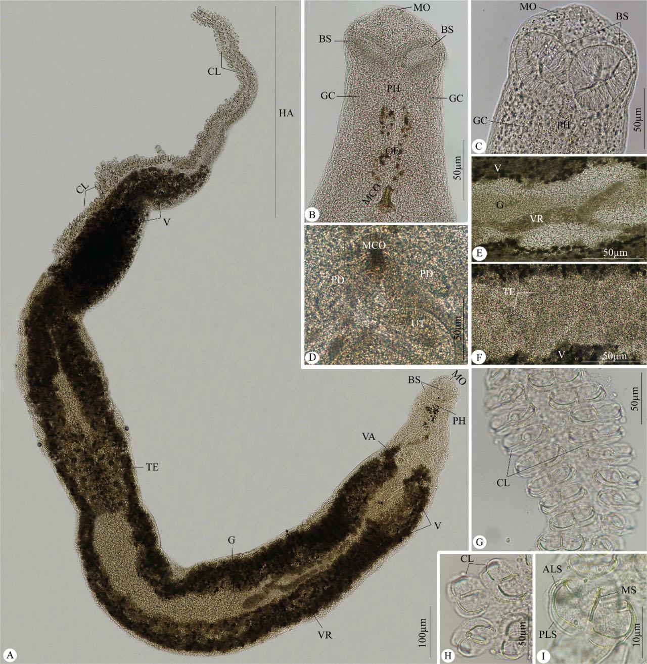 Photomicrographs of Polylabris lingaoensis. (A) Whole specimen. (B) Anterior part of prohaptor. (C) Detail of prohaptor. (D) Male copulatory organ and distal portion of seminal vesicle. (E) Germarium. (F) Testis. (G) Two clamp rows in the haptor. (H) Detail of haptoral clamps. (I) Structure of clamp. Note: ALS, antero-lateral sclerite; BS, buccal sucker; CL, clamps; G, Germarium; GC, gland cells; HA, haptor; MCO, male copulatory organ; Mo, mouth; MS, median sclerite; OE, oesophagus; PD, prostatic ducts; PH, pharynx; PLS, postero-lateral sclerite; TE, testes; UT, uterus; V, vitellaria; VA, vagina; VR, vitelline reservoir.