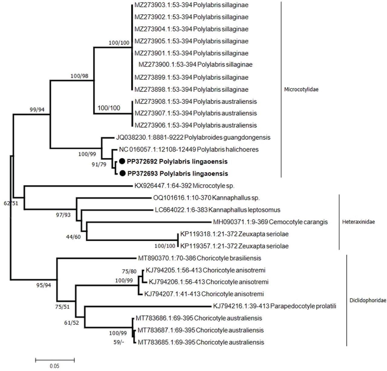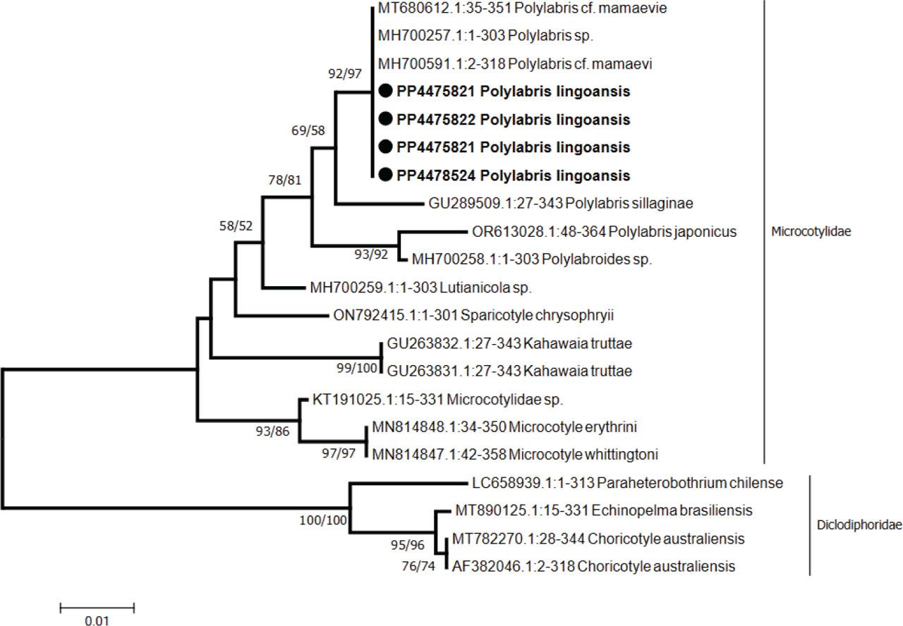 PCR amplification of the 28S rRNA and COI regions yielded 350 bp and 420 bp, respectively. The 28S rRNA gene provided four sequences, while the COI gene amplification produced two sequences. The sequences derived from the 28S rRNA region were all identical and were deposited in GenBank with the accession numbers PP375821 to PP375824. COI sequences were also deposited in GenBank, with accession numbers PP372692 and PP372693. The 28S rRNA sequences were grouped with those from the Family Microcotylidae, with two sequences from Polylabris cf. mamaevi (MT680612 and MH700591) and Polylabris sp. (MH700257) demonstrating a significant bootstrap value (Table 2). The sequences obtained in this study had a 100 % similarity to those of Polylabris cf. mamaevi and Polyabris sp. The present study’s sequences indicated 98 % similarity to Polylabris silaginae (GU289509), Polylabroides sp. (MH700258), and Lutianicola sp. (MH700259), as well as 97 % similarity to Polylabris japonicus (OR613028). Both Maximum Likelihood (ML) and Neighbor-Joining (NJ) phylogenetic trees based on 28S rRNA sequences revealed the same topology, with sequences related to P. lingaoensis obtained in the current study clustering with Polylabris cf. mamaevi and Polylabris sp. The present sequences were distinct from those of P. silaginae and P. japonicus (Fig. 2).