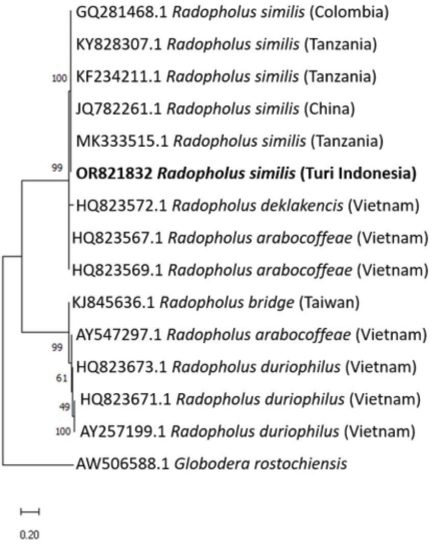 Morphometry of Radopholus similis females from Turi, Yogyakarta Special Region compared with R_ similis from Kerala (Roy et al_, 2018), and Netherlands (Xu et al_, 2014)_ Measurement unit = μm, mean ± standard deviation (range)_