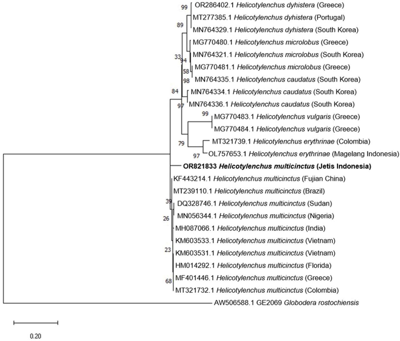 Morphometrics of Helicotylenchus multicinctus from the Jetis, Yogyakarta Special Region was compared with populations of H_ multicinctus from Greece ((Tzortzakakis et al_, 2017)_ Measurement unit = μm, mean ± standard deviation (range)_