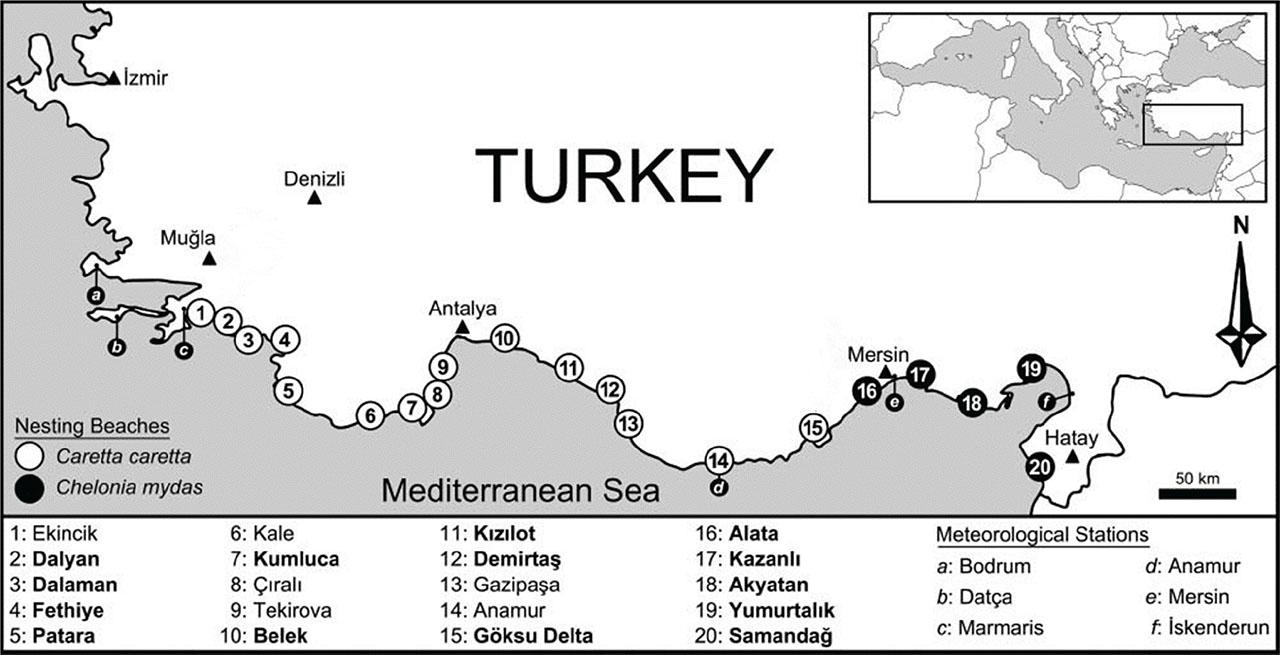 Nesting beaches of loggerhead and green sea turtles in Turkey, bolds indicate main nesting beaches (modified from Sarı and Kaska, 2015).
