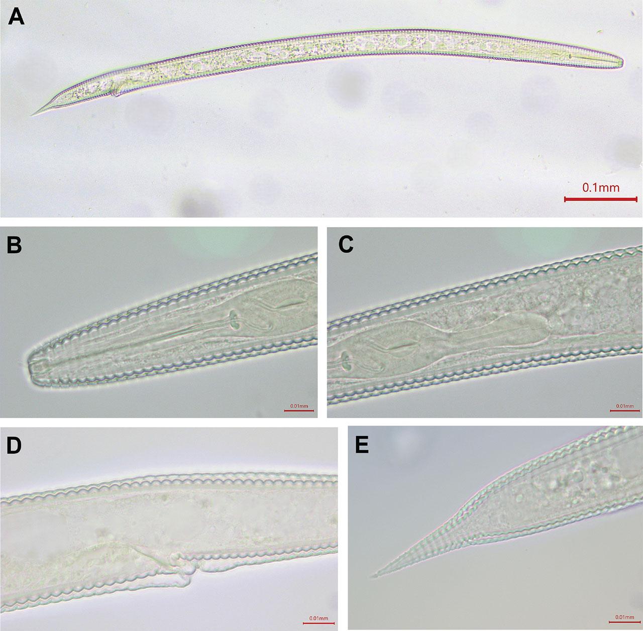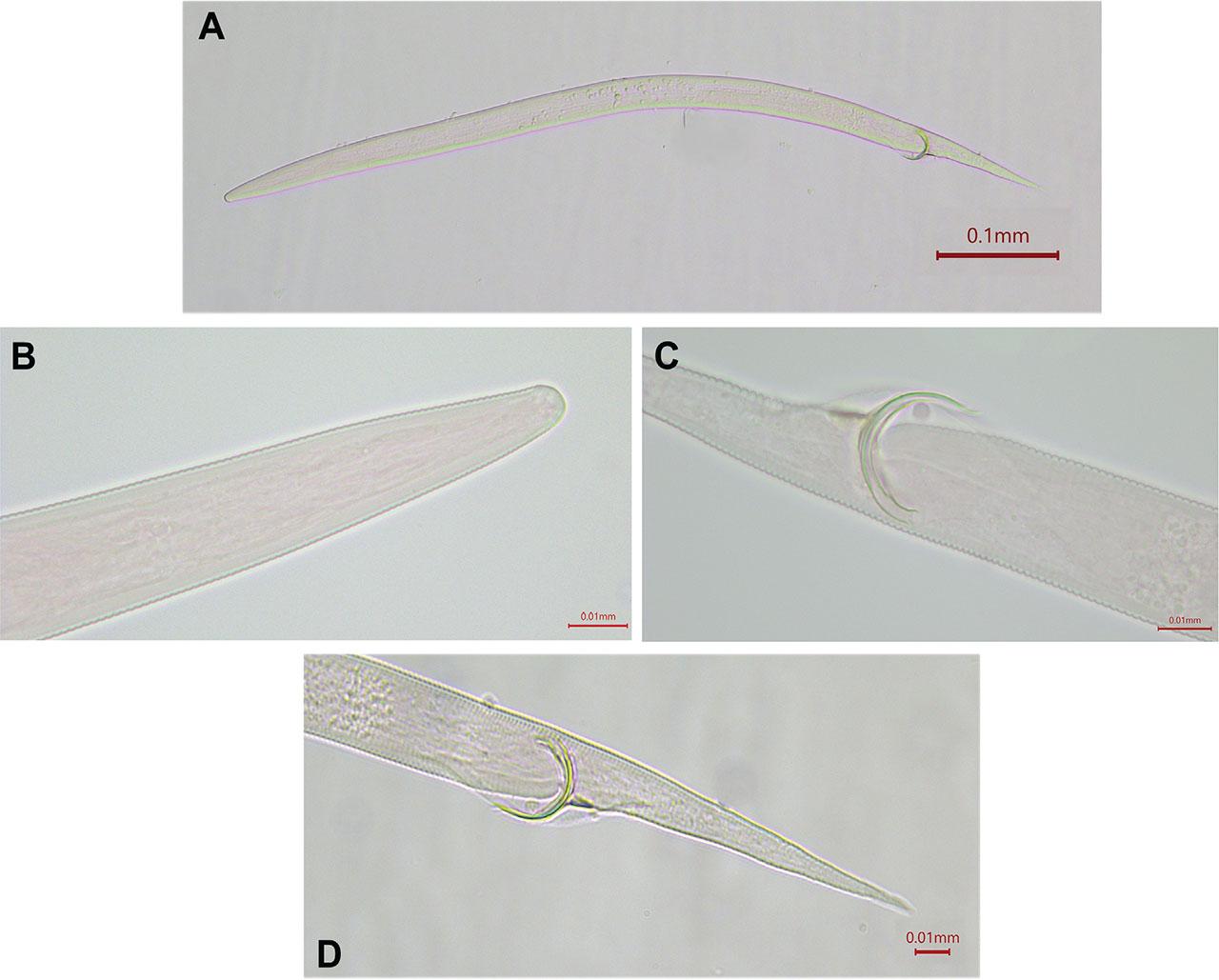 The morphological features of ten adult females are characterized by a slightly curved body ventrally; the cuticle outside the lateral field is divided into many small blocks by numerous longitudinal lines. Cuticular sheath is tightly adpressed to the body, the stylet is slightly curved, knobs rounded, backward sloping with distinct cavity at base, lip region is rounded with two annuli, the excretory pore is situated slightly posterior to the pharyngeal bulb, vulval lips are slightly protruding but not elongated, the lateral field begins with a single line in the anterior end of the body, then transitions into two or three longitudinal lines, with the tail tapering gradually to a conoid terminus (Fig. 1). Body length = 801.4 μm (735 – 840 μm), greatest body diameter = 43.5 μm (36 – 54 μm), stylet length = 70.7 μm (63 – 77 μm), a = 18.6 (15 – 23), pharynx length = 150.1 μm (130 – 180 μm), b = 5.3 (4.5 – 6.2), V (%) = 84 (78 – 87), m (%) = 69.4 (50 – 86), R = 216 (192 – 240), Rex = 50 (43 – 54), and Rv = 39 (35 – 45). The seven recovered adult males are characterized by a ventrally curved body. The lip region is rounded, not annulated, a stylet absent, a pharynx reduced, an excretory pore situated posterior to the base of the pharynx, a tail tapering gradually to a finely conoid pointed terminus, and a bursa well developed (Fig. 2). Body length = 678.9 μm (641 – 712 μm), greatest body diameter = 26.4 μm (21 – 32 μm), tail length = 113.6 μm (106 – 122 μm), Rv = 78 (70 – 84), spicules = 43.2 μm (36 – 49 μm), and gubernaculum = 8.6 μm (7 – 9.8 μm).