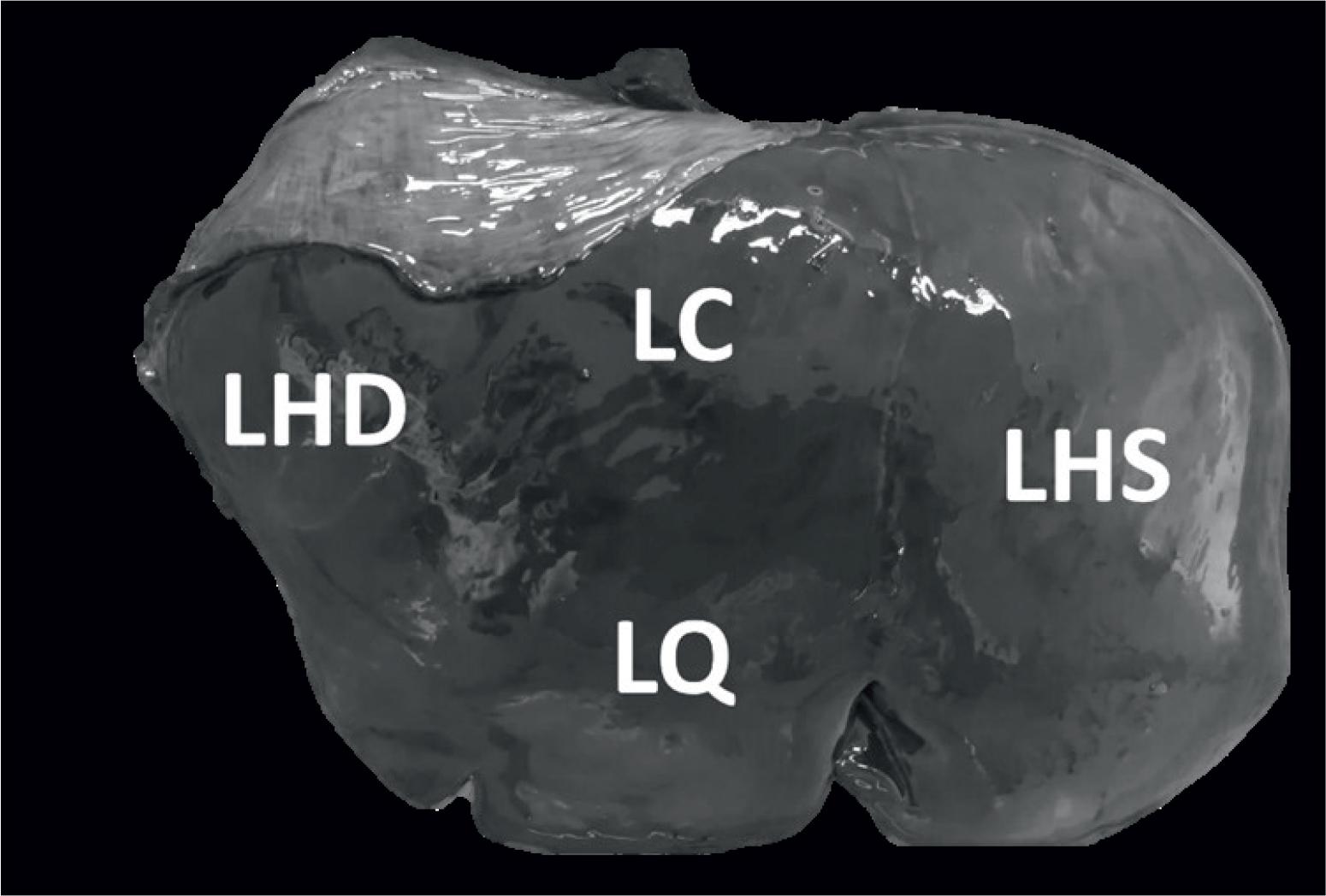 Division of livers into middle (lobus caudatus LC, lobus quadratus LQ), left (lobus hepatis sinister LHS) and right (lobus hepatis dexter LHD) sections.