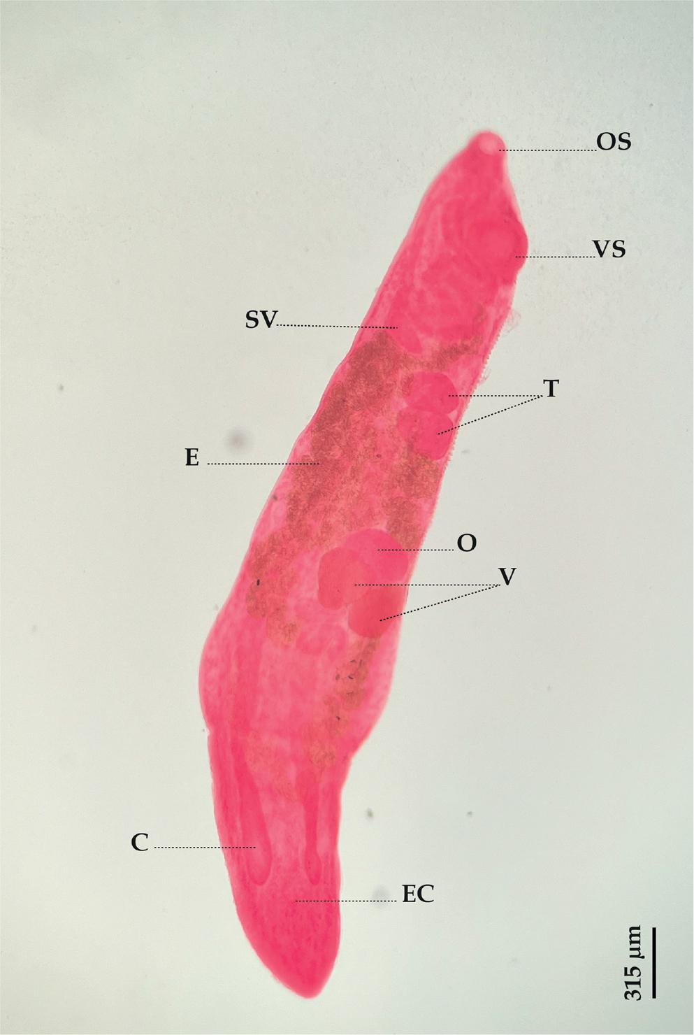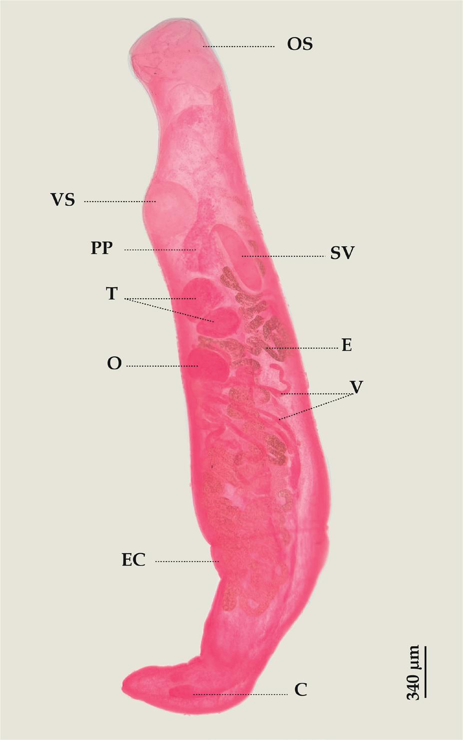 Lecithocladium excisum: (Lateral view), (C) Ceaca, (E) Eggs, (EC) Ecsoma, (O) Ovary, (OS) Oral sucker, (PP) Pars prostatica, (SV) Seminal vesicle, (T) Testes, (V) Vitellarium, (VS) Ventral sucker.