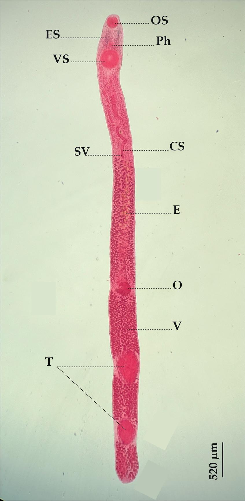 Tormopsolus orientalis: (Ventral view), (CS) Cirrus-sac, (E) Eggs, (ES) Eye-spot pigment, (O) Ovary, (OS) Oral sucker, (Ph) Pharynx, (SV) Seminal vesicle, (T) Testes, (V) Vitellarium, (VS) Ventral sucker.