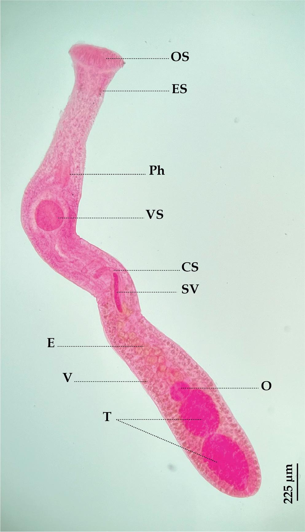 Stephanostomum euzeti: (Ventral view), (CS) Cirrus-sac, (E) Eggs, (ES) Eye-spot pigment, (O) Ovary, (OS) Oral sucker, (Ph) Pharynx, (SV) Seminal vesicle, (T) Testes, (V) Vitellarium, (VS) Ventral sucker.