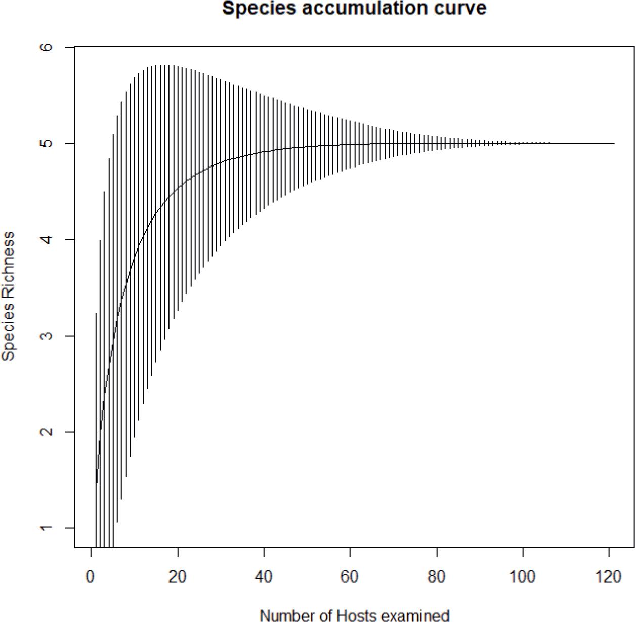 Species accumulation curve for the sampled Digenea from Seriola dumerili (n = 121) off the Algerian coast.