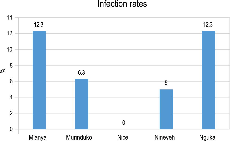 To initiate shedding, snails were briefly subjected to natural light between 10:00 AM and 12:00 PM. Mianya (12.3 %) had the highest infection rates, then Nguka (12.3 %), Murinduko (6.3 %), and Nineveh (5.0 %). On the other hand, Nice Stream showed no infection rates (Fig. 2). According to the chi-squared test, all five habitats are thought to be possible places for the spread of S. mansoni infections. The five study environments’ infection rates did not differ significantly (p = 0.105).