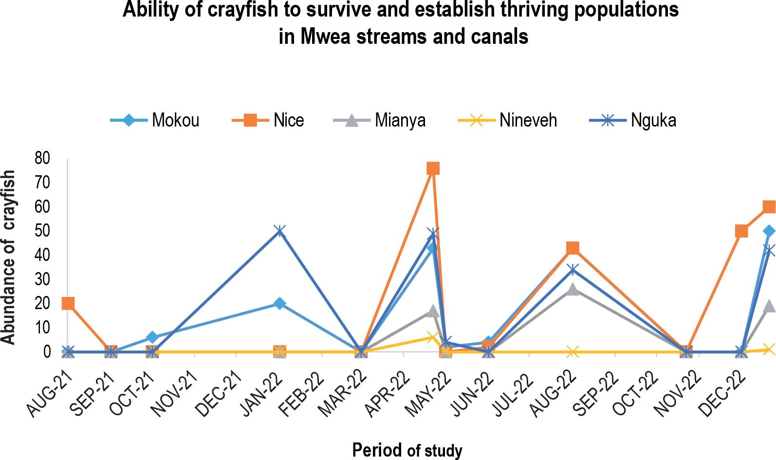 Ability of crayfish to survive and establish thriving populations in Mwea streams habitats after introduction.
