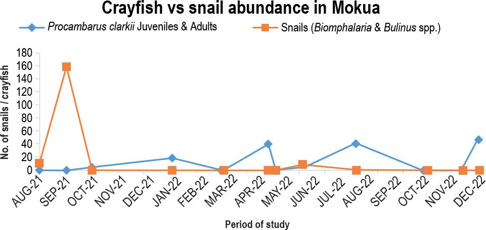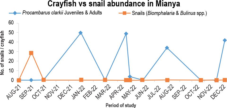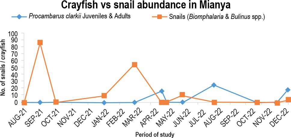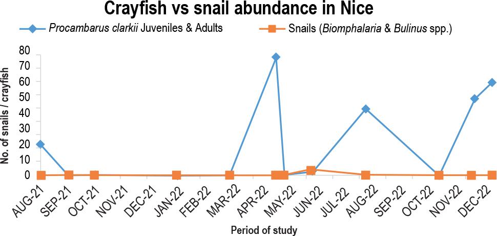 For the August 2021 sampling point, the Nice Stream near the Nice shopping complex had 20 crayfish and zero snails. The sampling point at 3 snails in June 2022 saw the sole high. The snails were eradicated mainly by crayfish, which peaked at 50 predators in the December 2022 survey point (Fig. 6).