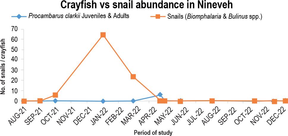 The number of snails in Nineveh, a habitat near the Kimbimbi hospital, peaked in January 2022 at 64. In December 2021 and April 2022, a small colony of crayfish with one and six predators, respectively, was discovered at this research site. Due to a lack of water in the canal and a decrease in vegetation cover brought on by human activity, no snails were captured between April and December 2022 (Fig. 7).