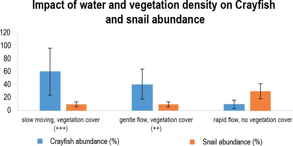 Impact of water velocity and vegetation cover on predation potential of crayfish against snails.