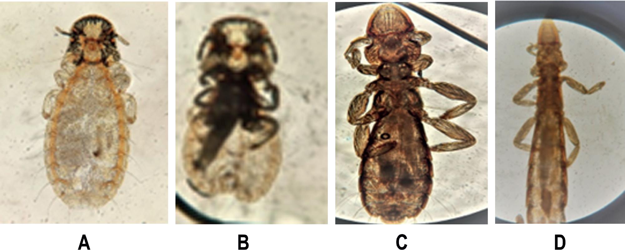 The detected lice. (A) Ventral side of C. compar (10X); (B) Dorsal side of C. compar (5X); (C) Male of C. tschulyschman (10X); (D) Female of C. tschulyschman (10X).