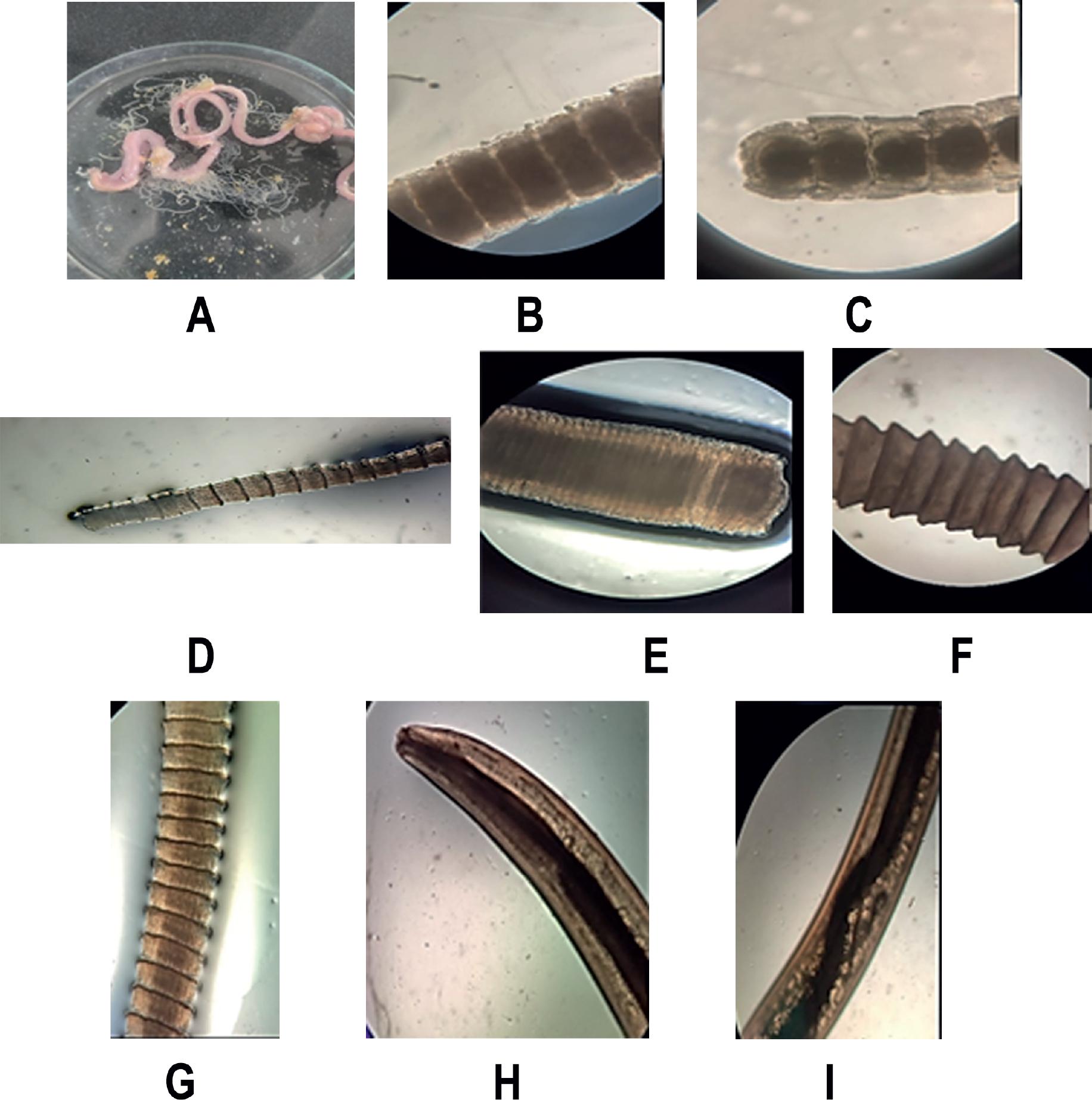 The detected endoparasites. (A) The dissected intestine showing the released cestodes; (B) R. tetragona; (C) R. micracantha; (D) C. digonopora; (E) C. intermedia; (F) B. columba; (G) C. infundibulum; (H) A. columbae (anterior part); (I) A. columbae (middle region).