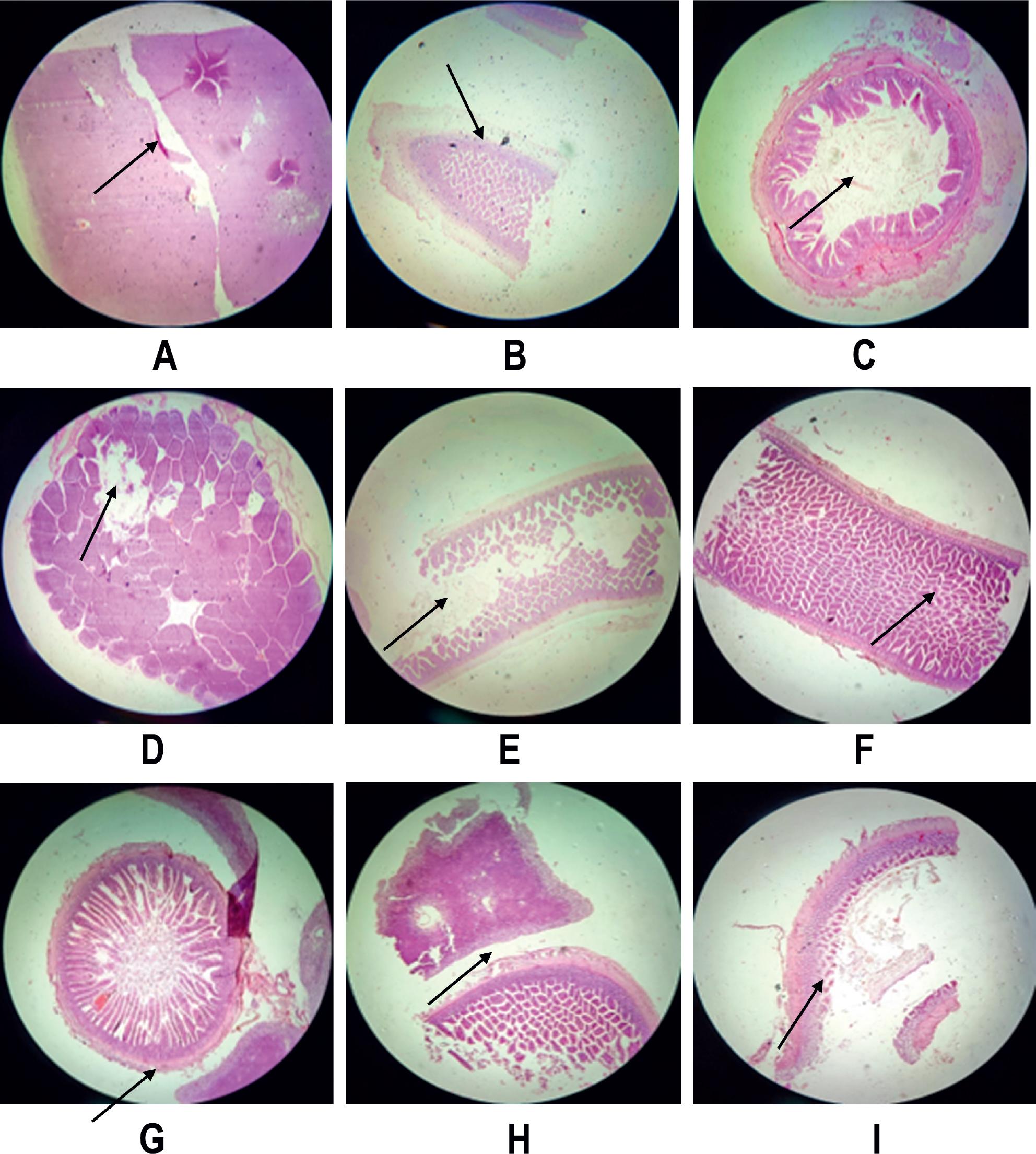 Photomicrograph of intestine tissue sections (stained with H & E), at 40X. (A) Duodenal part infected with cestodes, shows destruction and shrinkage; (B) Atrophic hyperplasia in the infected ileum with cestode; (C) Rectum infected with cestodes shows inflammation of villi; (D) Inflammation in infected rectum with cestodes; (E) Inflammation in caecum infected with cestode; (F) Death of cells in infected intestine with nematode; (G) Migratory tunnels formation in intestine infected with nematode; (H, I) Intestine infected with nematode shows infiltration of lymphocytes, inflammation and histological hyperplasia.