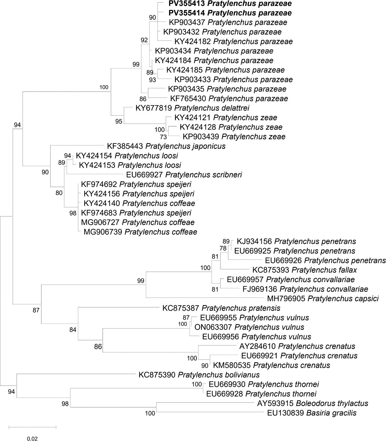 Phylogenetic relationships of Pratylenchus parazeae and related species based on the D2-D3 segment of 28S rDNA region, inferred using the Maximum Likelihood (ML) method with the K2+G+I model (BIC = 9596.839, AICc = 8978.033; lnL = –4412.786; +I = 0.40; +G = 1.23; R = 2.19; base frequencies: A = 0.25, T = 0.25, C = 0.25, G = 0.25). Numbers on branches represent bootstrap values from 1,000 replicates. Sequences generated in this study are indicated in bold.