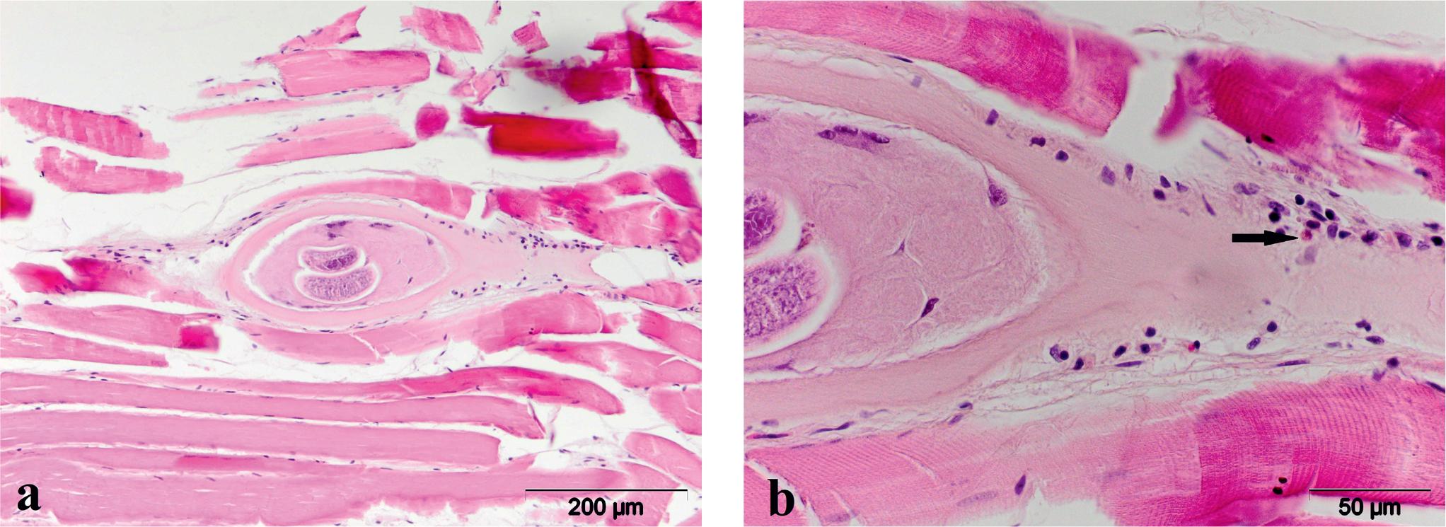 Histopathological examination revealed a large number of encapsulated Trichinella spp. larvae in the muscular tissue of the diaphragm. Mild inflammatory infiltrates, consisting primarily of mononuclear cells, lymphocytes, and macrophages, with individual eosinophils, were observed around the larvae (Fig. 2).