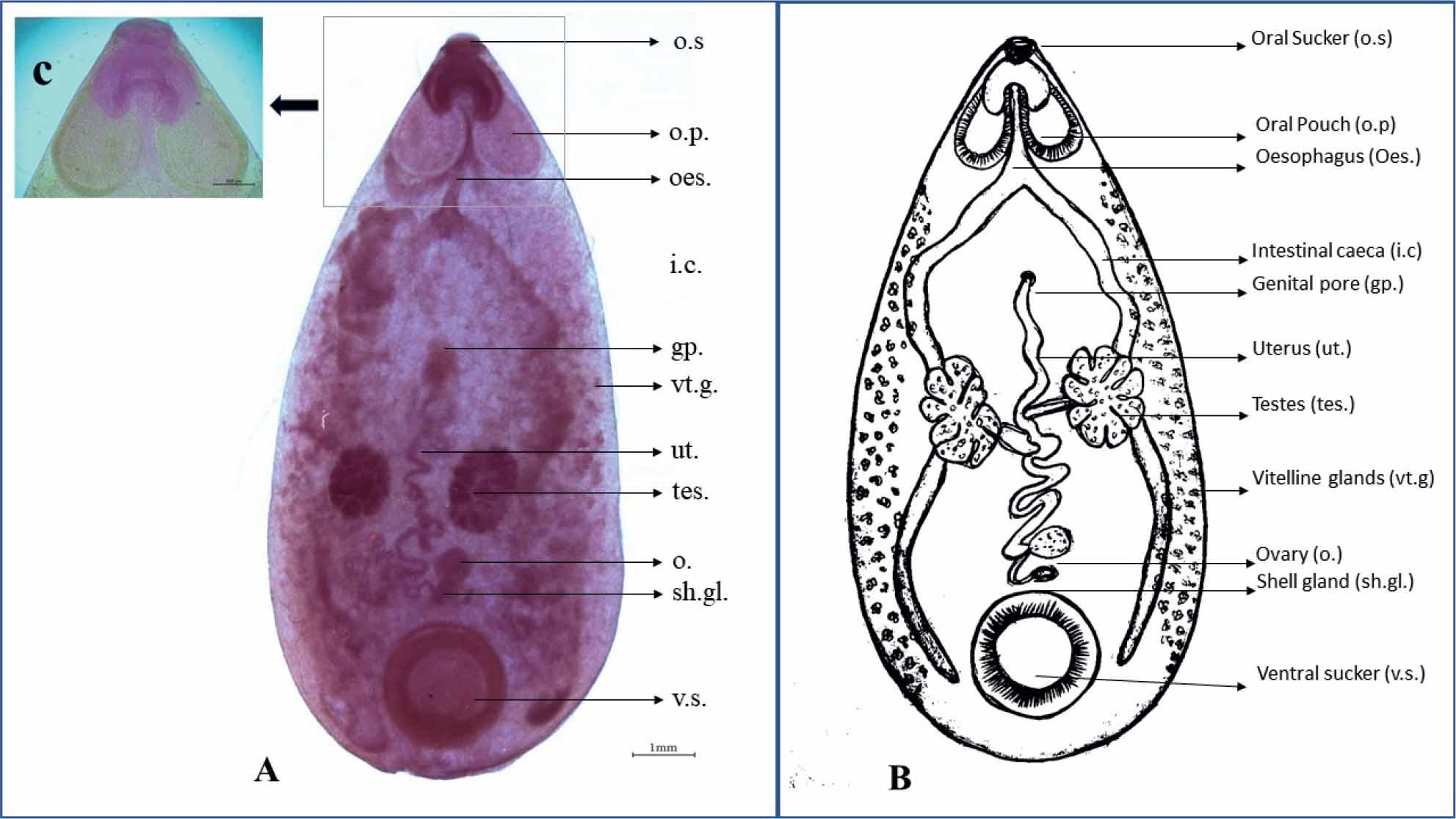 Pseudodiscus collinsi: A. Acetyl alum carmine stained adult intestinal fluke (o.s.: Oral sucker; o.p.: Oral pouch; oes.: Oesophagus; i.c.: Intestinal caeca; gp.: Genital pore; vt.g.: Vitelline glands; ut.: Uterus; tes.: Testes; o.: Ovary; sh.gl.: Shell gland; v.s.: Ventral sucker) B. Line diagram of adult Pseudodiscus collinsi C. Oral pouches of adult Pseudodiscus collinsi.