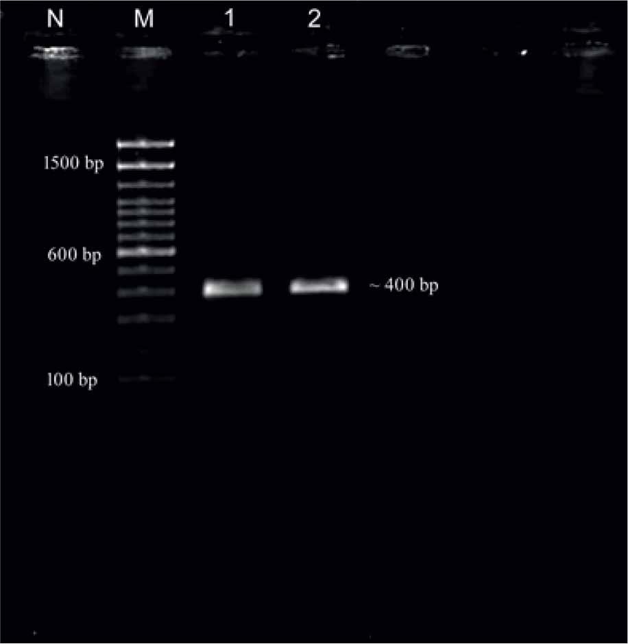 PCR amplification ITS-2 (~400 bp) of P. collinsi (Lane M: 100 bp plus ladder, Lane 1,2: P. collinsi samples, Lane N: Negative control).
