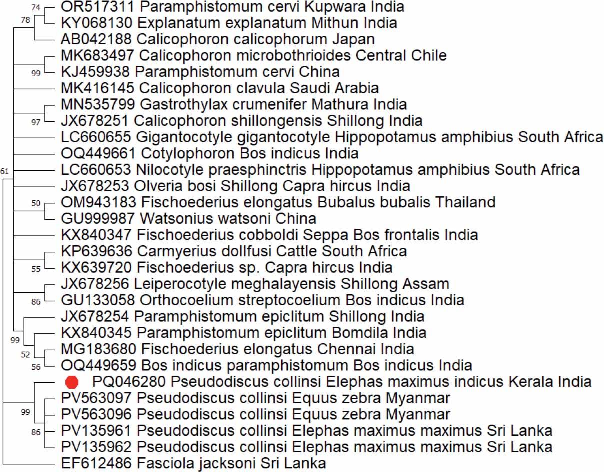 Fasciola jacksoni (bile ducts and duodenum), Pseudodiscus collinsi (large intestine), P. hawkesii (large intestine), Pfenderius pappillatus (large intestine), P. birmanicus (large intestine), P. heterocaeca (large intestine), Gastrodiscus secundus (large intestine) and Bivitellobilharzia nairi (Portal and mesenteric vein) are the common flukes found in elephants (Fowler & Mikota, 2006; Bapu, 1936). The members of the Paramphistomoidea superfamily are widely distributed across the world, with the highest prevalence in the tropical and subtropical regions (Tandon et al., 2014). Their immature flukes are embedded in the intestinal mucosa and cause hemorrhagic or catarrhal enteritis. The adults collectively cause a disease referred to as amphistomosis or stomach fluke disease in mammalian livestock. Pseudodiscus collinsi is one of the members of the superfamily Paramphistomoidea (Cobbold, 1882) that occurs in the colon of elephants and equines. Pseudodiscus infection in elephants is characterized by clinical symptoms like anorexia, dehydration, inability to walk and severe foul-smelling diarrhea (Muraleedharan & Keshavaprasad, 2001). Pseudodiscus collinsi and Gastrodiscus secundus were previously reported in two captive Indian elephants with edema, pinhead-sized hemorrhages, and ulcerative patches in their caecal mucosa (Islam et al., 1999). Amphistomosis is commonly diagnosed by detecting eggs in feces and morphologically identifying adult flukes. The species-level identification of amphistomes based on ova is a big challenge due to their similarity. Histological examination of the median sagittal section of the acetabulum, pharynx and genital atrium of flukes is another mode of morphological identification (Nasmark, 1937). The previous reports of P. collinsi (Bhalerao 1931, 1933; Nasmark, 1937; Malik et al., 1958; Rai, 1959; Peter & Srivastava, 1960; Gupta & Walia,1970; Muraleedharan & Keshavaprasad, 2001) were based on the adult morphology, without genetic confirmation of species identity. Molecular characterization might help in identifying and studying genetic variation and evolutionary history. In the present study, adult flukes from the large intestine of a wild Indian elephant were morphologically described and molecularly characterized by the ribosomal ITS-2 sequence.
