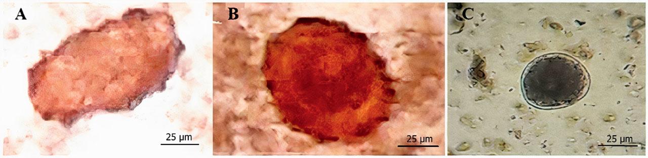 Microscopic images show ascarid nematode eggs identified in cattle fecal samples: (A) and (B) present fertilized and unfertilized A. suum eggs, respectively, and (C) displays the eggs of Toxocara vitulorum.