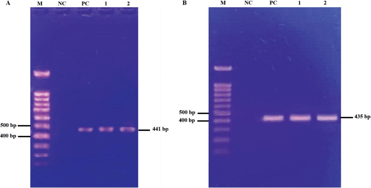 Gel electrophoresis showing Cox-1 mtDNA partial sequences amplification of T. vitulorum and A. suum samples. Legend: (A) Lanes display the Cox-1 mtDNA gene of T. vitulorum at 441 bp. M indicates the 1 kb size marker; NC and PC represent negative and positive controls, respectively. Lanes 1 and 2 contain DNA samples of T. vitulorum. (B) Lanes show the Cox-1 mtDNA gene of A. suum at 435 bp. M indicates the 1 kb size marker; NC and PC represent negative and positive controls, respectively. Lanes 1 and 2 contain DNA samples of A. suum.