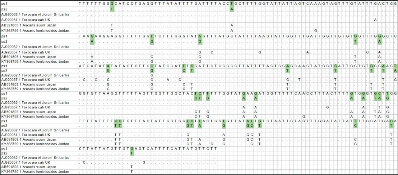 Legend: The green boxes in the alignment indicate key polymorphic sites between our two isolated sequences from the ascarid species (ps1 and ps2).