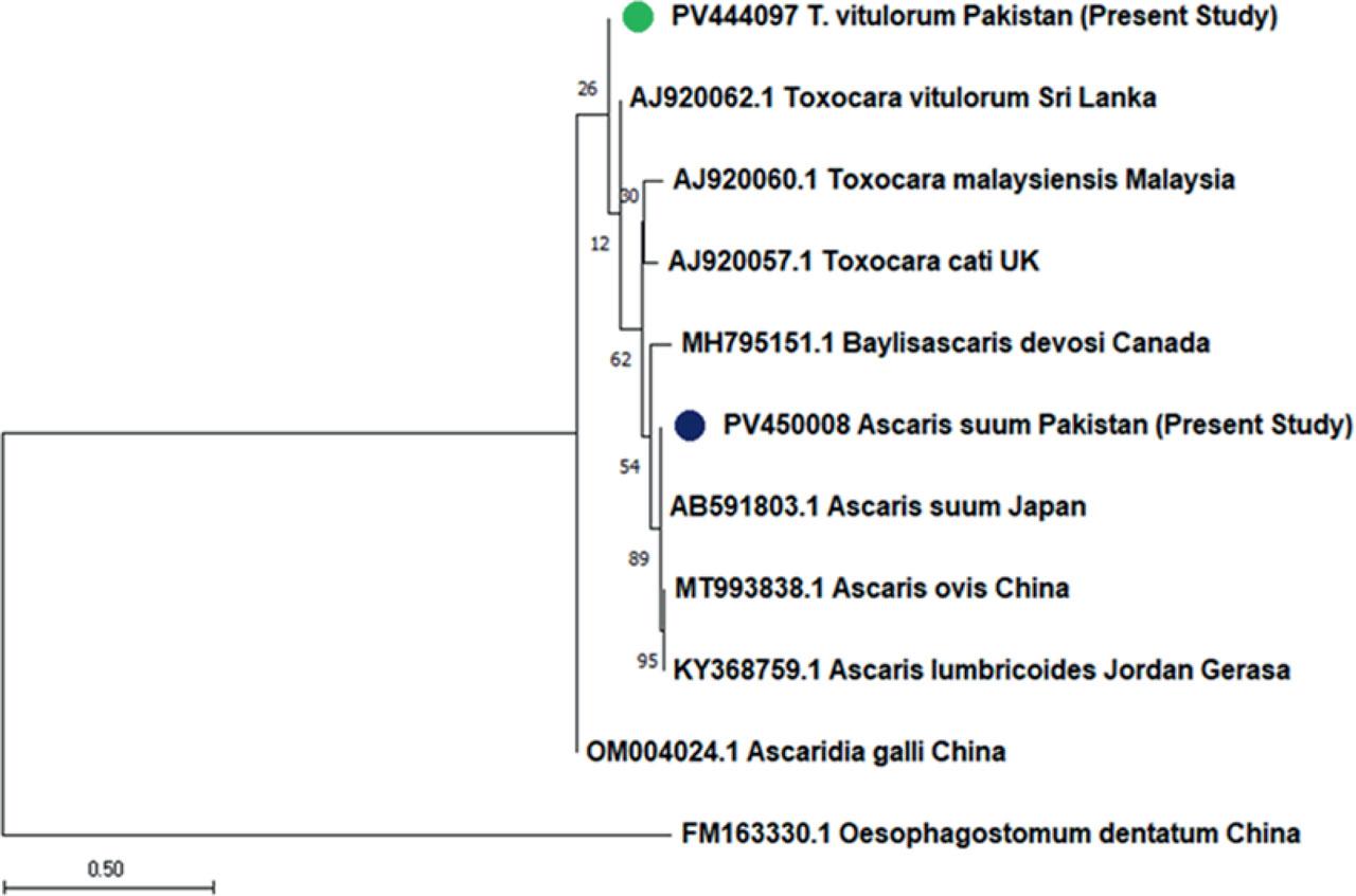 A phylogenetic tree was constructed using the mitochondrial Cox-1 gene to infer the evolutionary relationships between the two nucleotide sequences. The tree was scaled according to evolutionary distances calculated with the Maximum Likelihood method, representing the number of base substitutions per site. A total of 441 base positions were analyzed. Isolate 1 (GenBank accession no. PV444097) from the Upper Dir district clustered closely with a T. vitulorum sequence from Sri Lanka (GenBank accession no. AJ920062), showing 99.77 % identity. In contrast, it displayed lower similarity to other ascarid species, including T. cati from the UK (AJ920057; 92.29 %) and T. malaysiensis from Malaysia (AJ920060; 91.84 %). The outgroup used was Oesophagostomum dentatum from China (FM163330). The optimal tree obtained had a total branch length of 0.20150985, confirming that the partial Cox-1 mitochondrial DNA sequence from isolate 1 belonged to T. vitulorum (Fig. 5). Similarly, Isolate 2 from the Swat district showed a close genetic relationship to an A. suum isolate from Japan (AB591803), with 97.77 % identity. (Fig. 5).